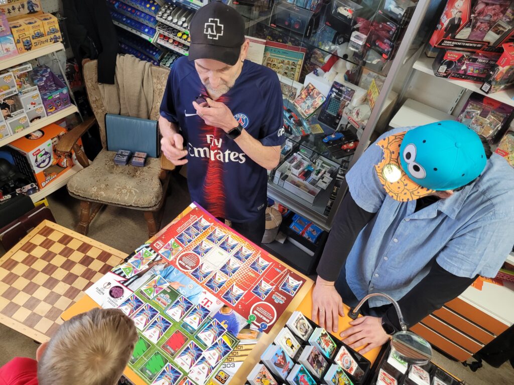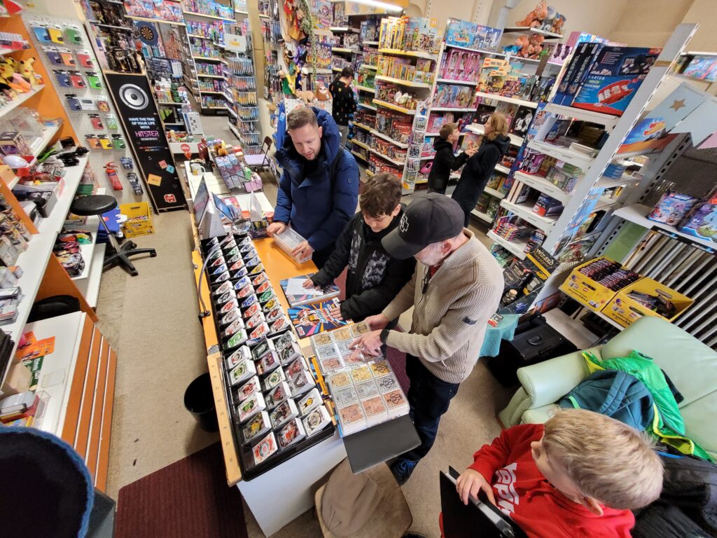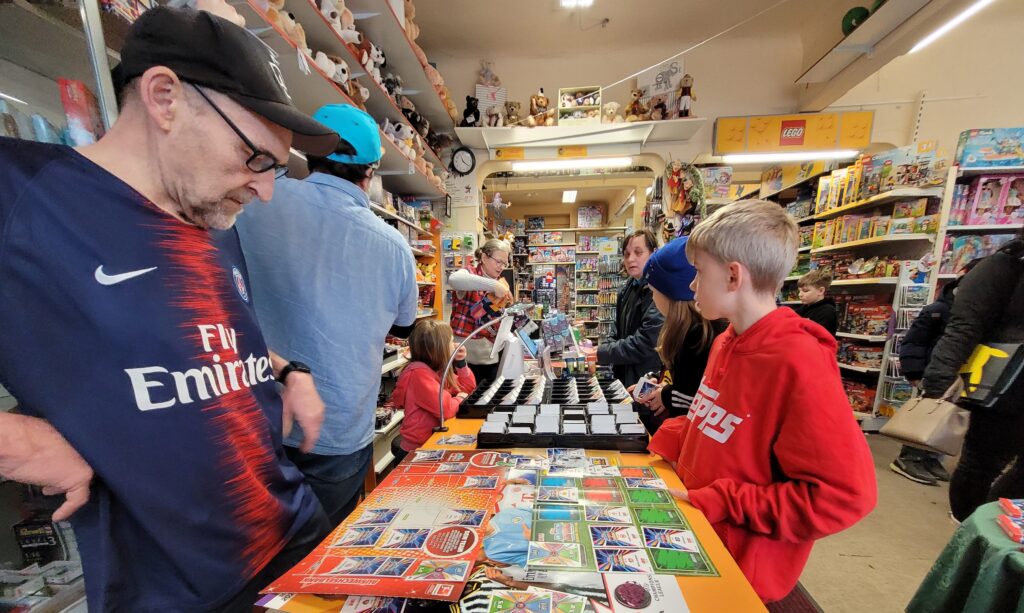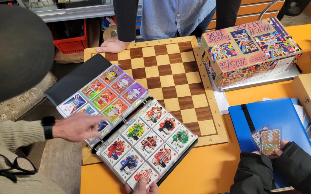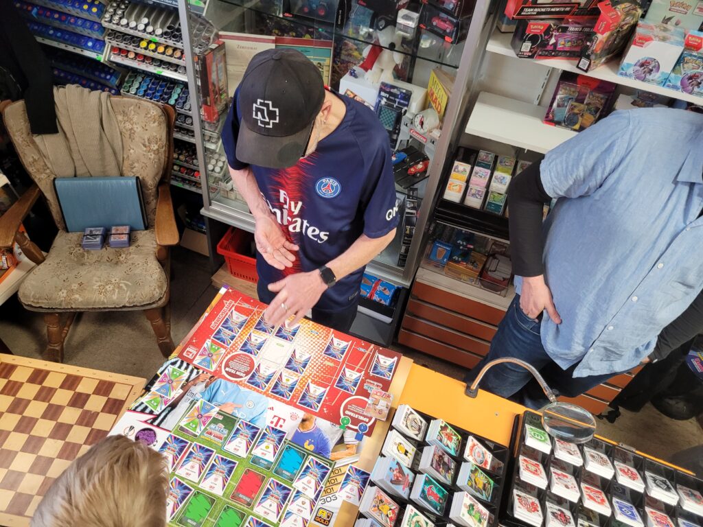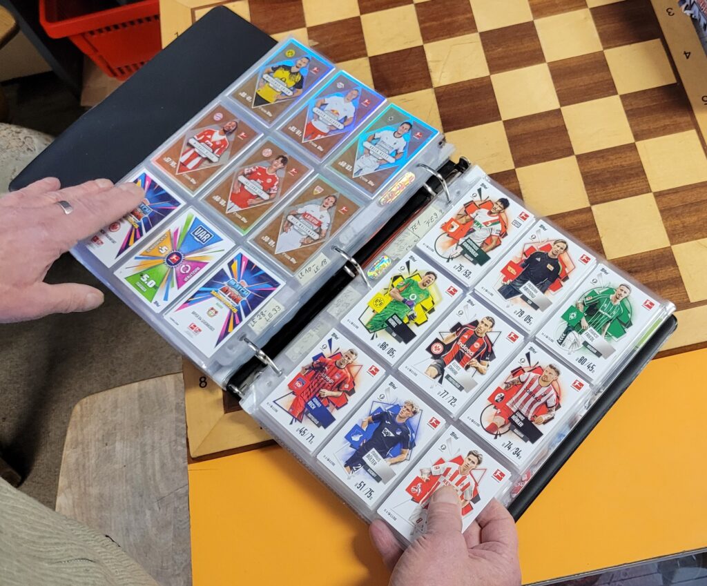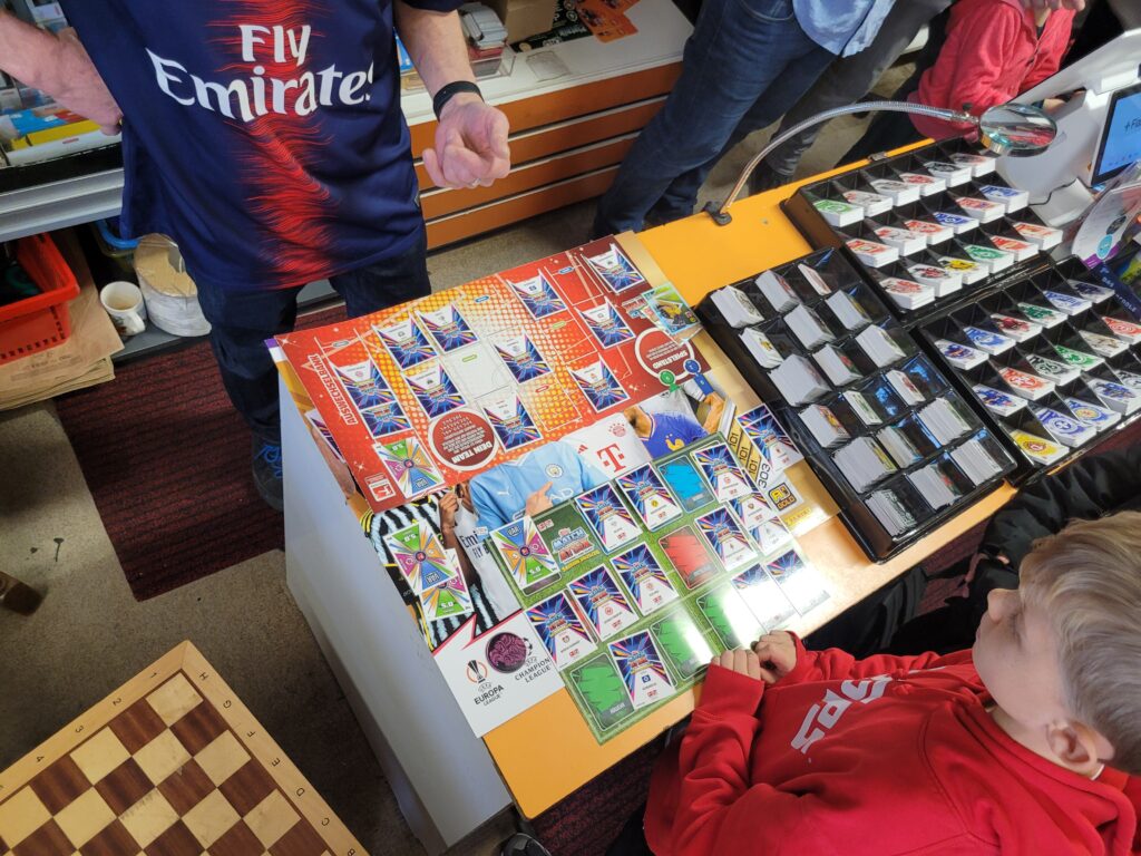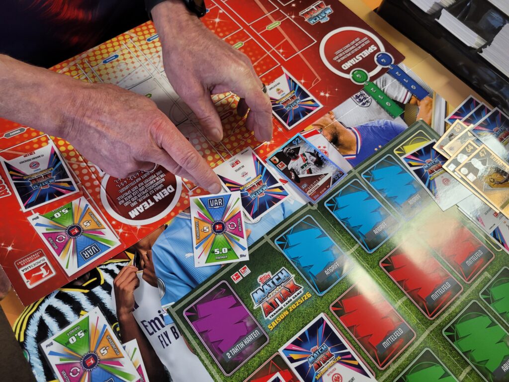 Immer am zweiten Samstag in einem Monat finden sich im Kindertraum ab diesem Jahr topps-Sammler ein. Neben der Tauschbörse gibt es den erfahrenen ausgefuchsten Trainer Carsten, der seit über 15 Jahren in der topps Match Attax Community verankert ist und jede Menge Fanwissen hat. Abgesehen von seiner Fußballbegeisterung weiß er auch, wie man dieses Trading Card Game spielt. Ihn zu besiegen, ist eine Herausforderung. Einer seiner jungen Schüler – Carsten gibt auch AGs im Kartenspiel – hat ihn fast schlagen können. Beim Kampf Carsten gegen Charlie stand es kurz schlecht um den Meister, ehe er das Blatt noch einmal drehen konnte und das Match mit 6:5 für sich entschied. Als Trostpflaster gab Ladeninhaber Robert dennoch ein Päckchen Attax-Karten aus.