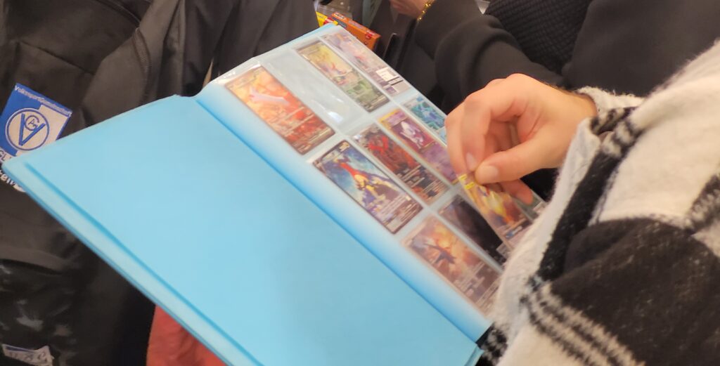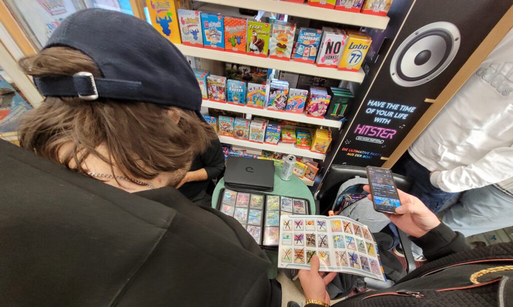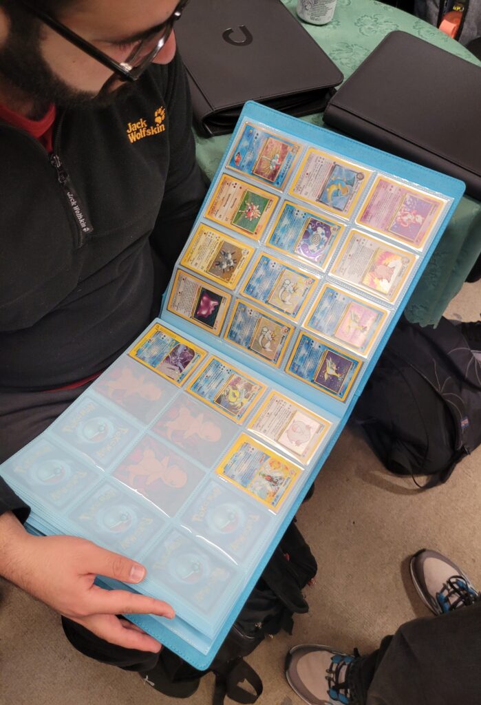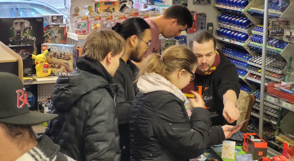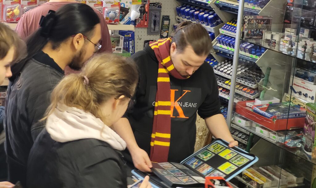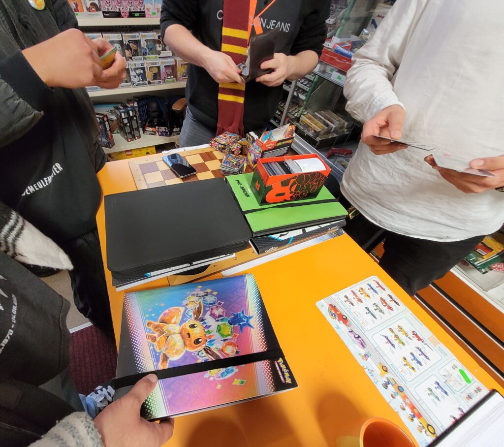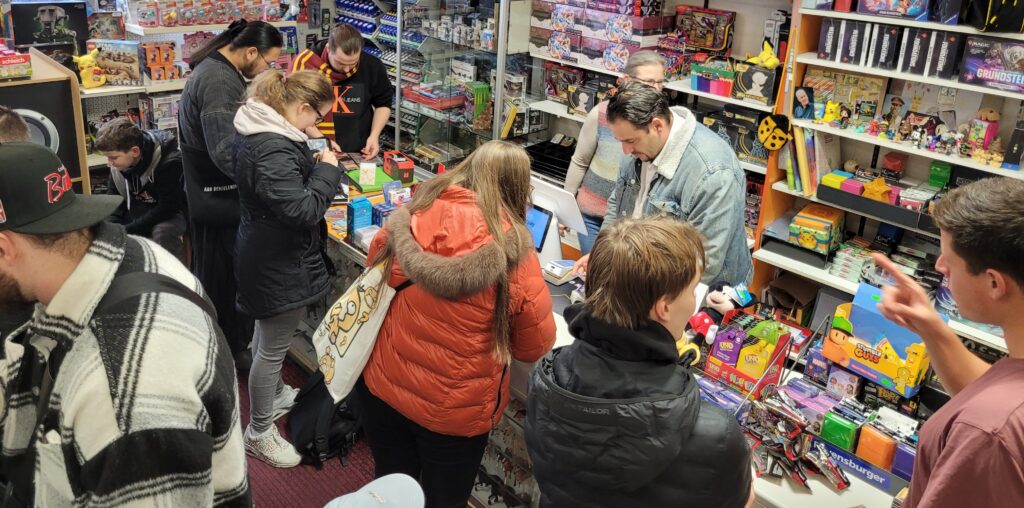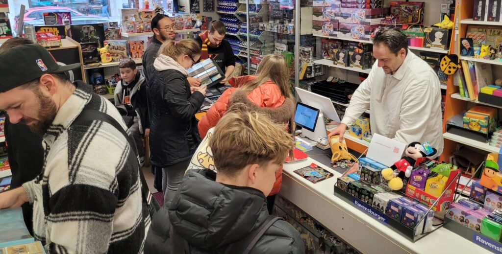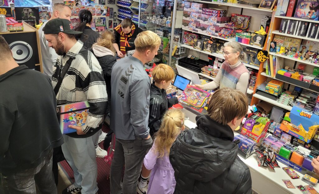 In der Menge erkennt man Sammler, die regelmäßig hier zu Gast sind, aber auch immer neue, die erst noch zaghaft in den Laden schauen und am Ende ins Gespräch mit anderen vertieft sind und die Gelegenheit nutzen, ihre Alben zu präsentieren und die eine oder andere doppelte Karte zu tauschen. Darunter sind Schätze wie auch Dupletten, die dann aus einem Album ins andere wechseln. Die Atmoshäre ist gelöst, manche packen ihre Karten aus, die sie eben erworben haben und jubeln, wenn sie besonders wertvolle gezogen haben. Andere fachsimpeln über Karten aus ihren mitgebrachten Sammelmappen. Wer nicht nichts mit Pokémonkarten am Hut hat, wird sich wundern, in welcher Sprache hier gesprochen wird. Die Pokemonfans sind aber glücklich, da unter sich. Im Bereich um die Kasse stehen die Erwachsenen, im Puzzle-Raum hinten hocken Kinder und Teenager auf dem Boden und beäugen ihre Schätze. Es gibt auch ganze Familien, die an diesem Tag in den Kindertraum pilgern.