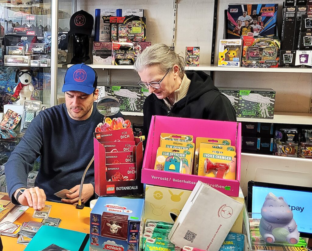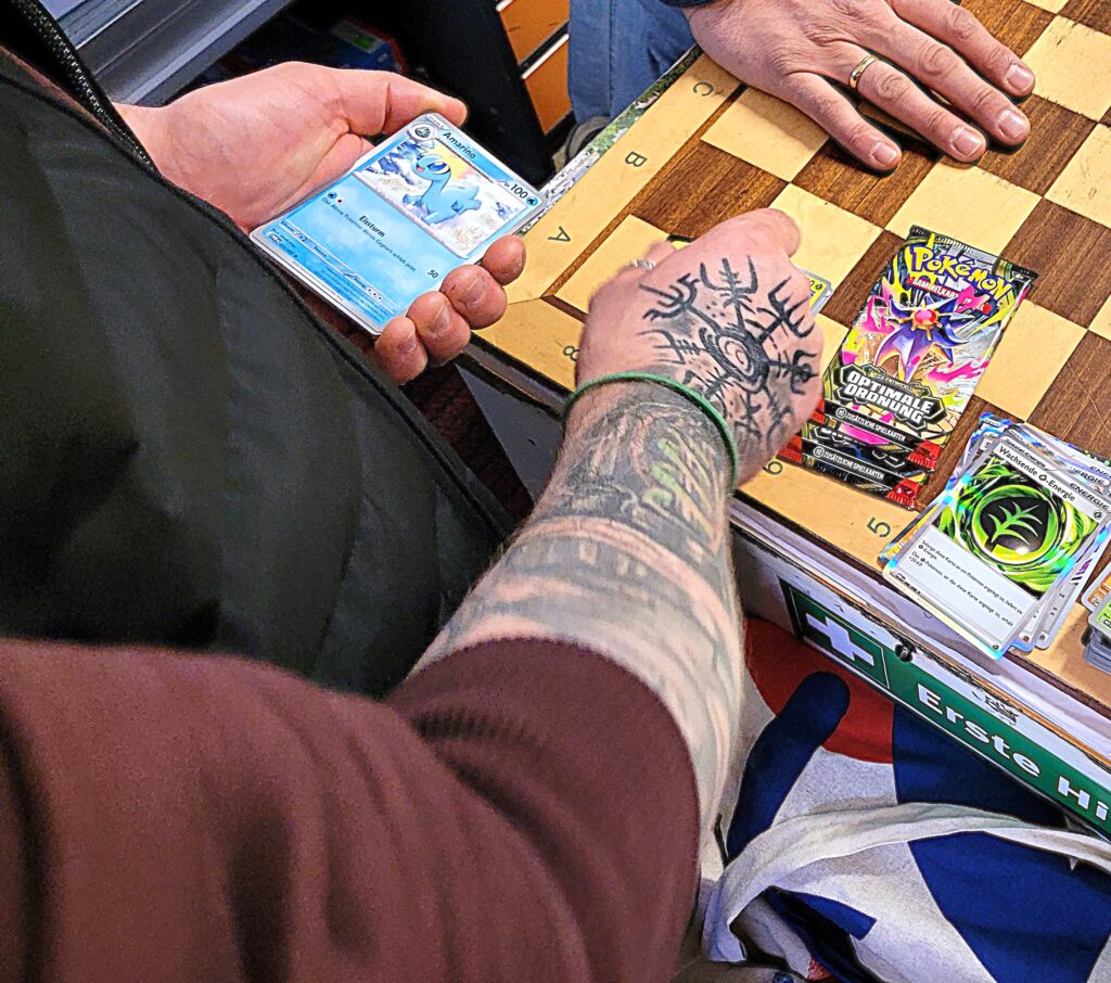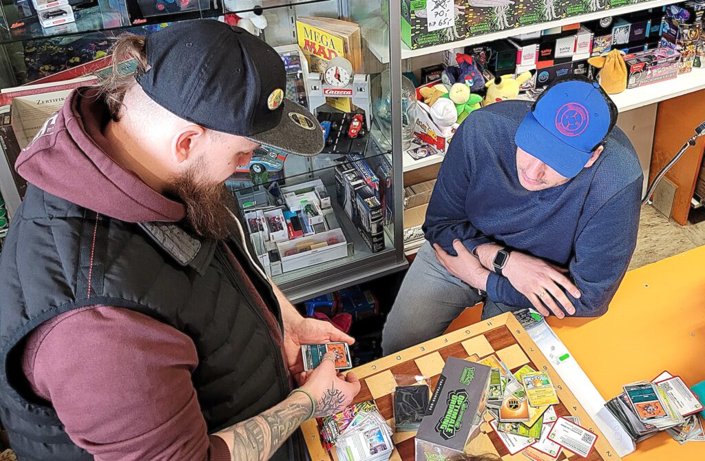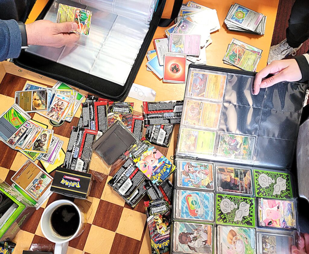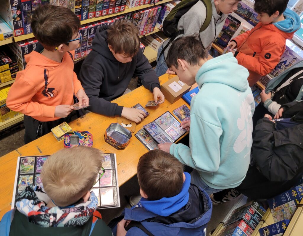 Eine erfreuliche Entwicklung für die Pokemunity, vielleicht in Zusammenhang mit dem Beginn der Osterferien zu sehen? Gleich am ersten Ferientag brummte der Laden und es waren vor allem Kids. Die Pokémunity hat sozusagen Nachwuchs bekommen und übergibt den Staffelstab an die nächste Generation. Jedenfalls hat es sich wohl rumgesprochen, dass im Kindertraum nicht nur Pokémon-Karten verkauft, sondern auch getauscht werden können. Dabei gibt es zwei Regeln, Kinder tauschen nur mit Kindern, der Ladenbesitzer und sein Team schauen dabei, dass es fair zugeht. Und die Regel Nummer zwei, am besten nur Karten gegeneinander tauschen, die einen ähnlichen Wert haben. Heute, Samstag den 28.März 2026, waren auch viele Newcomer dabei, die älteren Kids erklärten den neuen gerne, wie es geht. Am Tresen standen die erwachsenen Sammler und tauschten Karten und Wissen aus, im Hinterzimmer traf sich die Jugend und es wurde mitunter so voll, dass Zeitfenster ausgeteilt werden mussten. Die Stimmung war ausgelassen und gut und ein paar Eltern dankten dem Team vom Kindertraum, dass es die Gelegenheit zum Tauschen und Sammlung Präsentieren überhaupt in Tegel gibt. Interessant auch, dass es nicht wenige Eltern gab, die selbst schon bei der „First Generation“ dabei waren und ein paar Schätze zuhause haben und jetzt mit ihren Kindern kamen. Ein stolzer Papa kam sogar mit einem Spezialkoffer, um einige seltene Karten vor Ort zu zeigen! Hier ein paar Eindrücke des Events.