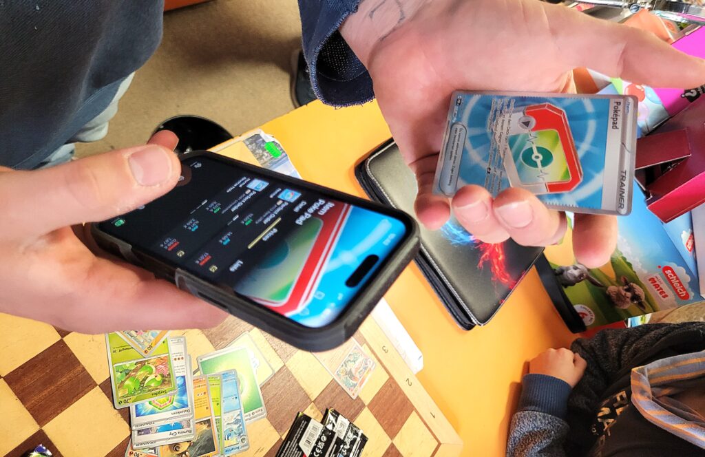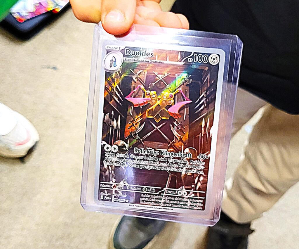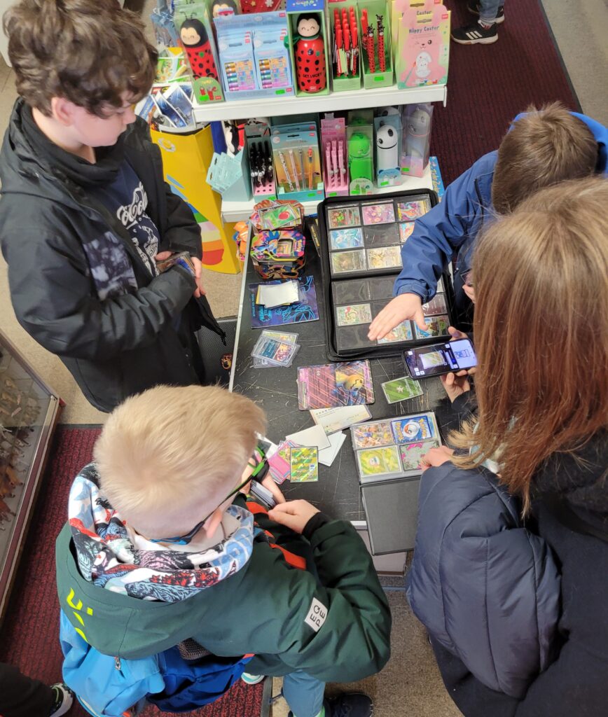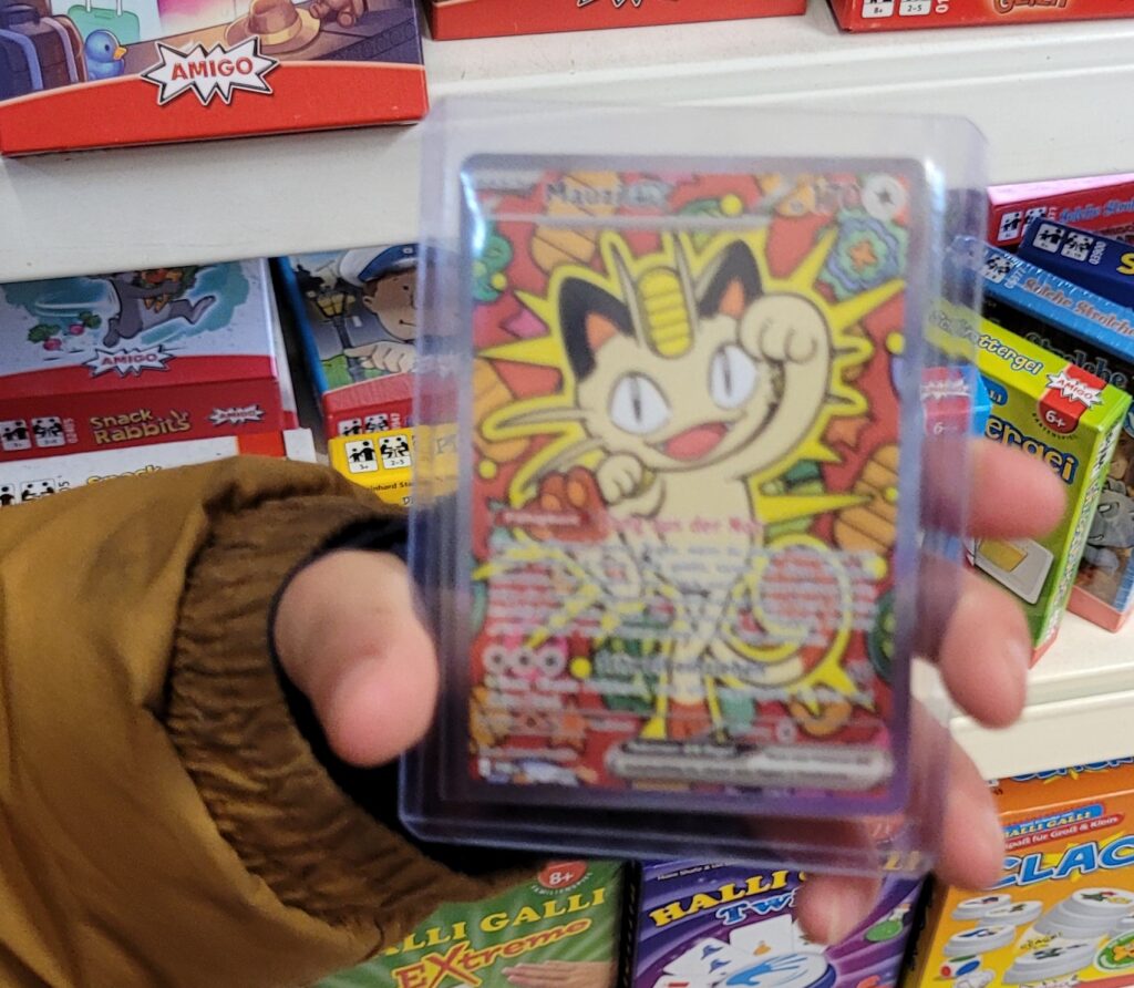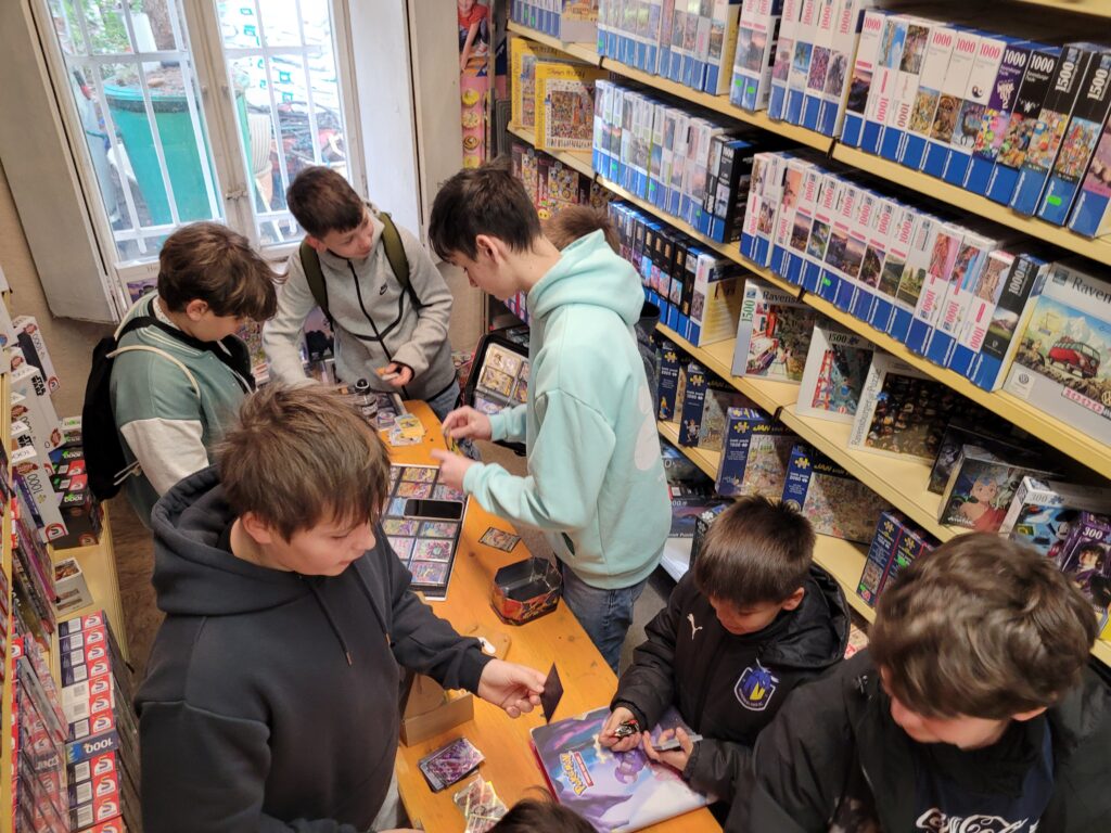 Eine erfreuliche Entwicklung für die Pokemunity, vielleicht in Zusammenhang mit dem Beginn der Osterferien zu sehen? Gleich am ersten Ferientag brummte der Laden und es waren vor allem Kids. Die Pokémunity hat sozusagen Nachwuchs bekommen und übergibt den Staffelstab an die nächste Generation. Jedenfalls hat es sich wohl rumgesprochen, dass im Kindertraum nicht nur Pokémon-Karten verkauft, sondern auch getauscht werden können. Dabei gibt es zwei Regeln, Kinder tauschen nur mit Kindern, der Ladenbesitzer und sein Team schauen dabei, dass es fair zugeht. Und die Regel Nummer zwei, am besten nur Karten gegeneinander tauschen, die einen ähnlichen Wert haben. Heute, Samstag den 28.März 2026, waren auch viele Newcomer dabei, die älteren Kids erklärten den neuen gerne, wie es geht. Am Tresen standen die erwachsenen Sammler und tauschten Karten und Wissen aus, im Hinterzimmer traf sich die Jugend und es wurde mitunter so voll, dass Zeitfenster ausgeteilt werden mussten. Die Stimmung war ausgelassen und gut und ein paar Eltern dankten dem Team vom Kindertraum, dass es die Gelegenheit zum Tauschen und Sammlung Präsentieren überhaupt in Tegel gibt. Interessant auch, dass es nicht wenige Eltern gab, die selbst schon bei der „First Generation“ dabei waren und ein paar Schätze zuhause haben und jetzt mit ihren Kindern kamen. Ein stolzer Papa kam sogar mit einem Spezialkoffer, um einige seltene Karten vor Ort zu zeigen! Hier ein paar Eindrücke des Events.