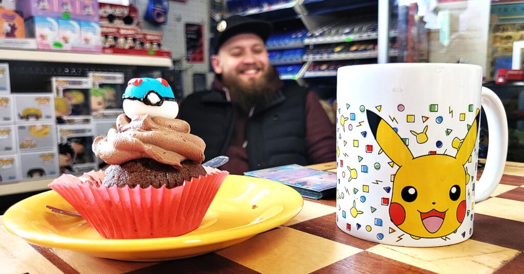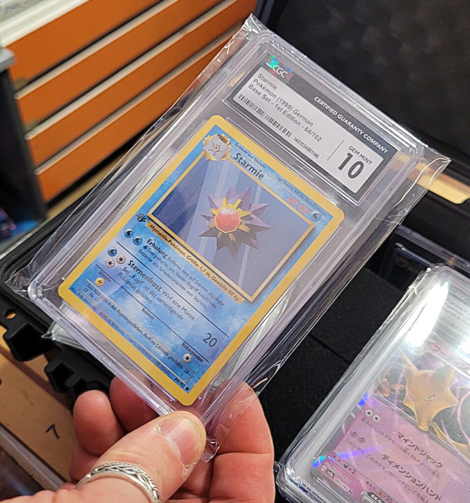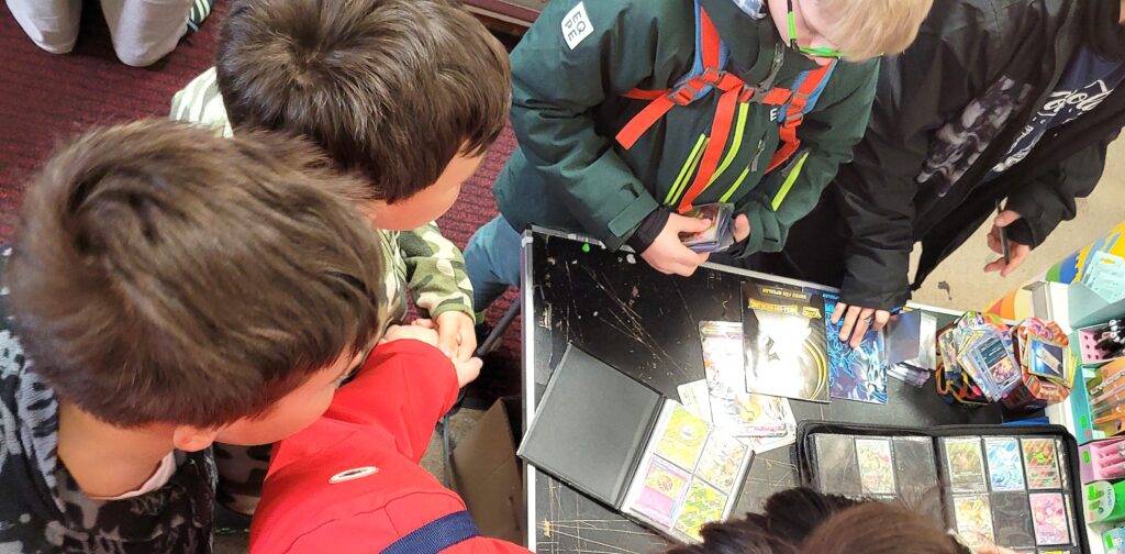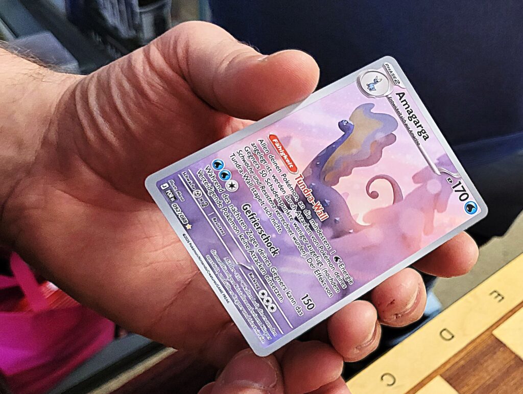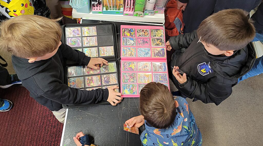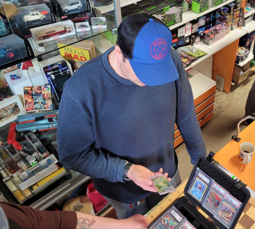 Eine erfreuliche Entwicklung für die Pokemunity, vielleicht in Zusammenhang mit dem Beginn der Osterferien zu sehen? Gleich am ersten Ferientag brummte der Laden und es waren vor allem Kids. Die Pokémunity hat sozusagen Nachwuchs bekommen und übergibt den Staffelstab an die nächste Generation. Jedenfalls hat es sich wohl rumgesprochen, dass im Kindertraum nicht nur Pokémon-Karten verkauft, sondern auch getauscht werden können. Dabei gibt es zwei Regeln, Kinder tauschen nur mit Kindern, der Ladenbesitzer und sein Team schauen dabei, dass es fair zugeht. Und die Regel Nummer zwei, am besten nur Karten gegeneinander tauschen, die einen ähnlichen Wert haben. Heute, Samstag den 28.März 2026, waren auch viele Newcomer dabei, die älteren Kids erklärten den neuen gerne, wie es geht. Am Tresen standen die erwachsenen Sammler und tauschten Karten und Wissen aus, im Hinterzimmer traf sich die Jugend und es wurde mitunter so voll, dass Zeitfenster ausgeteilt werden mussten. Die Stimmung war ausgelassen und gut und ein paar Eltern dankten dem Team vom Kindertraum, dass es die Gelegenheit zum Tauschen und Sammlung Präsentieren überhaupt in Tegel gibt. Interessant auch, dass es nicht wenige Eltern gab, die selbst schon bei der „First Generation“ dabei waren und ein paar Schätze zuhause haben und jetzt mit ihren Kindern kamen. Ein stolzer Papa kam sogar mit einem Spezialkoffer, um einige seltene Karten vor Ort zu zeigen! Hier ein paar Eindrücke des Events.